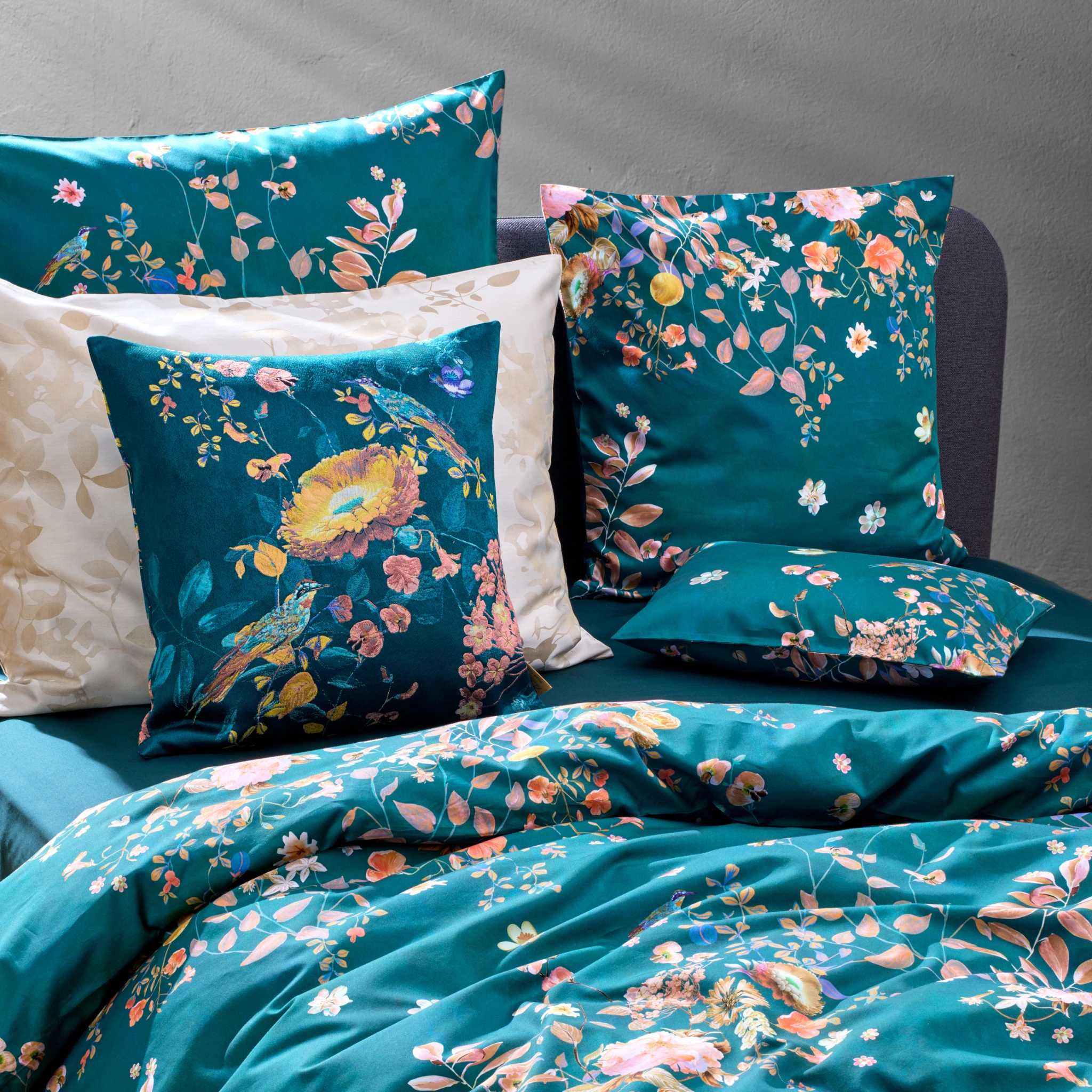 Entdecken Sie die luxuriöse Satin-Bettwäsche Christian Fischbacher Fantasia – ein Meisterwerk aus feinster Baumwolle mit einem traumhaften, floralen Design auf tiefem Petrol-Fond. Diese Bettwäsche vereint edle Materialien, künstlerische Raffinesse und höchste Verarbeitungsqualität für Ihr Schlafzimmer.