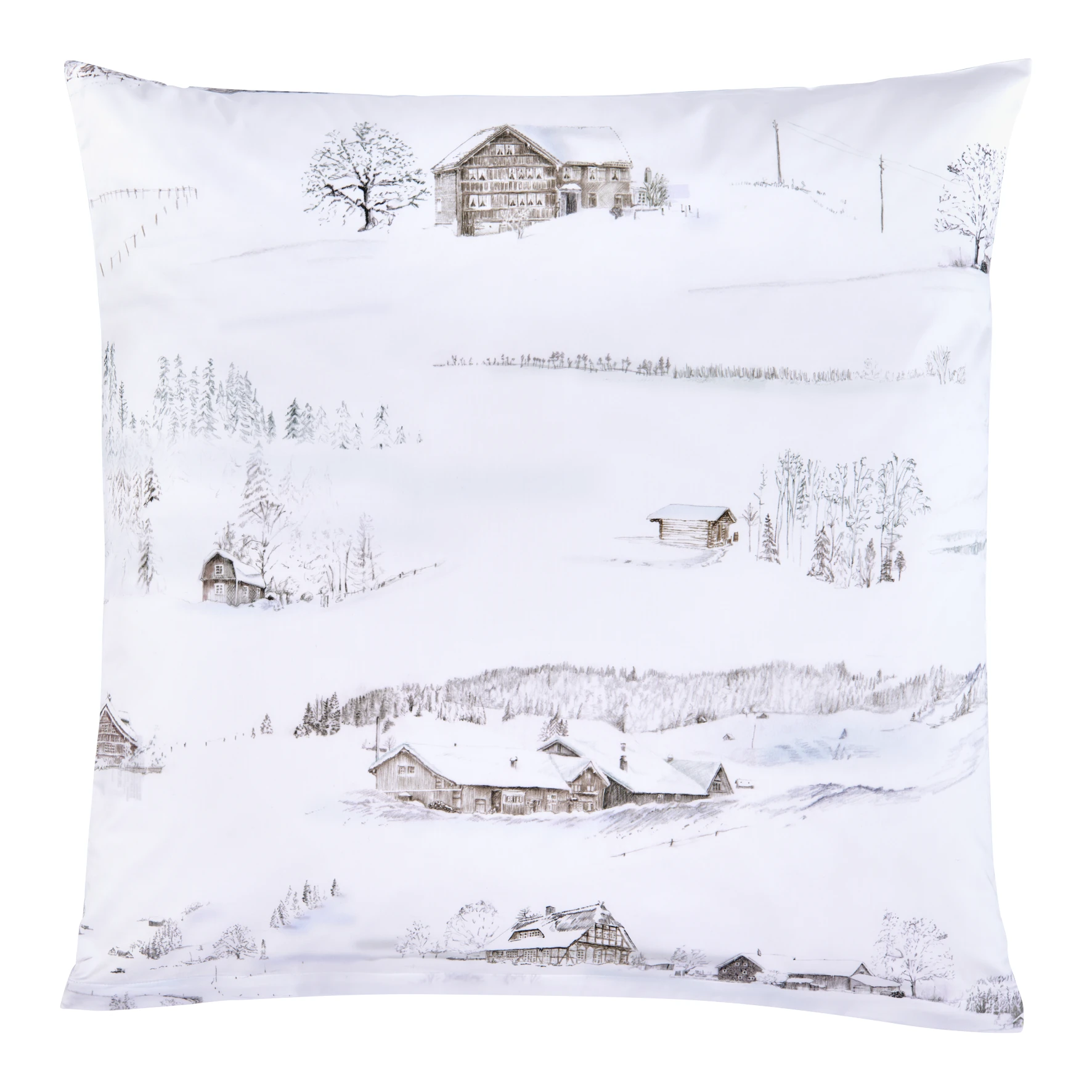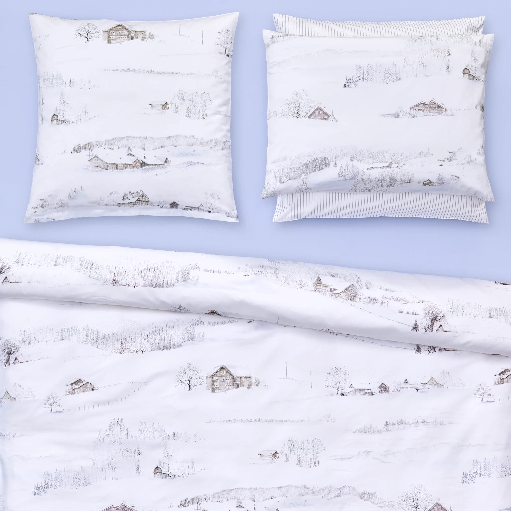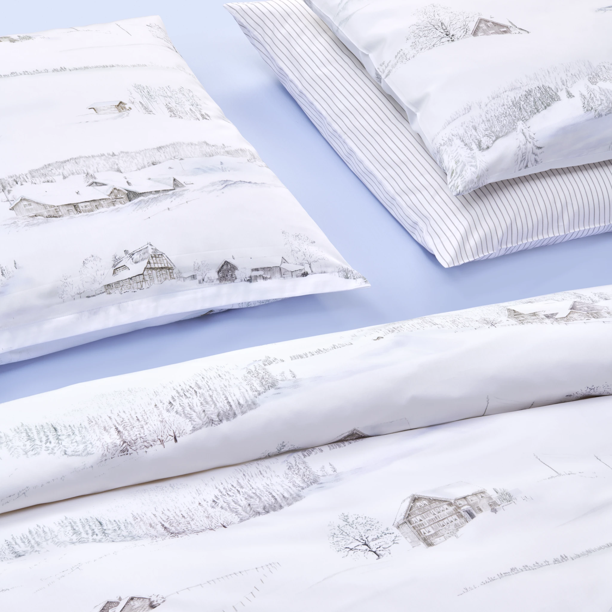 Vor Ihnen erstrecken sich schneeweiße Landschaften, begleitet vom gedämpften Knirschen der Fußstapfen im Schnee. Zwischen den sanften Hügeln thronen heimelige Chalets und gemütliche Bauernhäuser. Die mit Bleistift gezeichneten Motive verleihen dem Design White Season eine warme, erzählerische Aura. Lassen Sie sich von der Stille des Winters und der Behaglichkeit dieser Szenerie umhüllen.