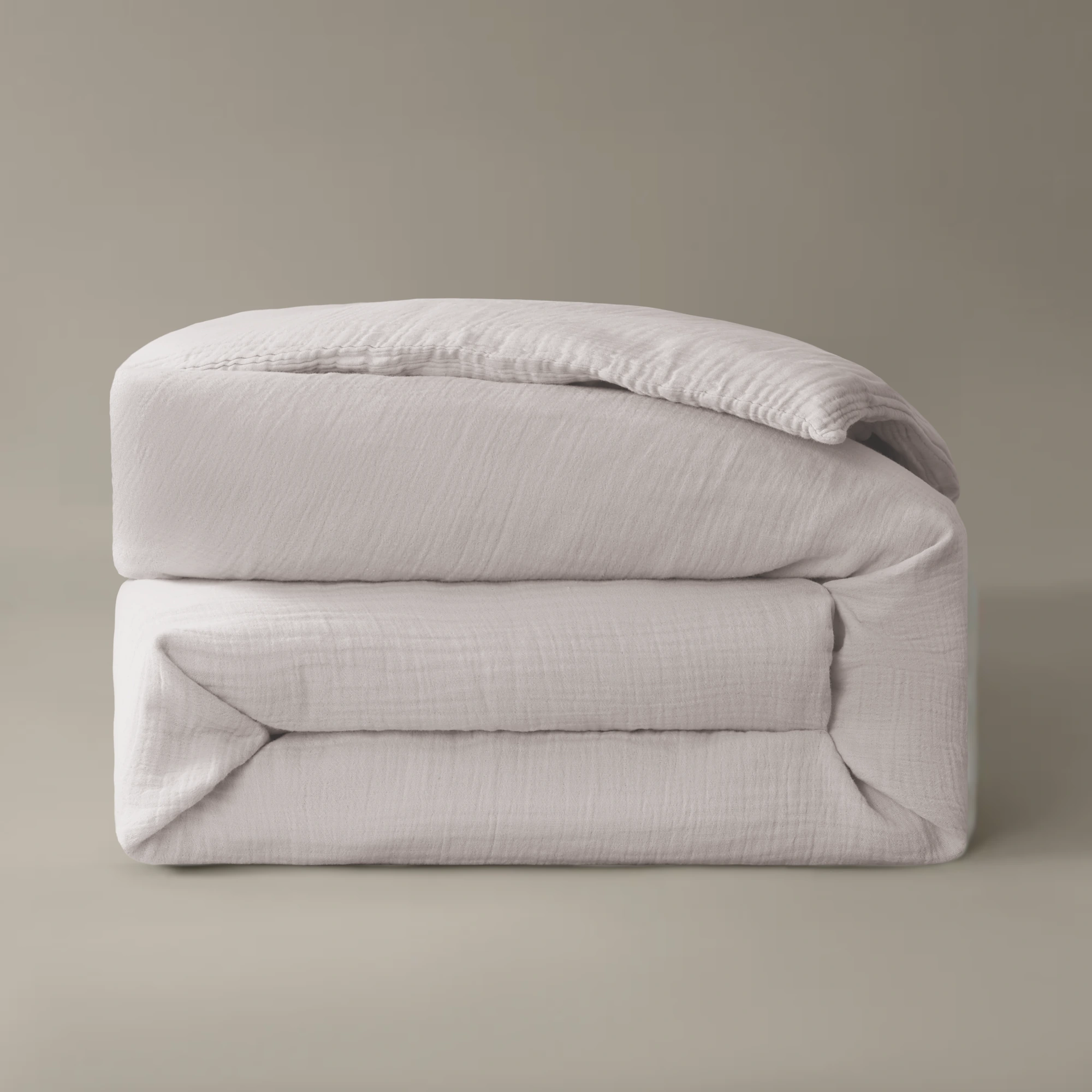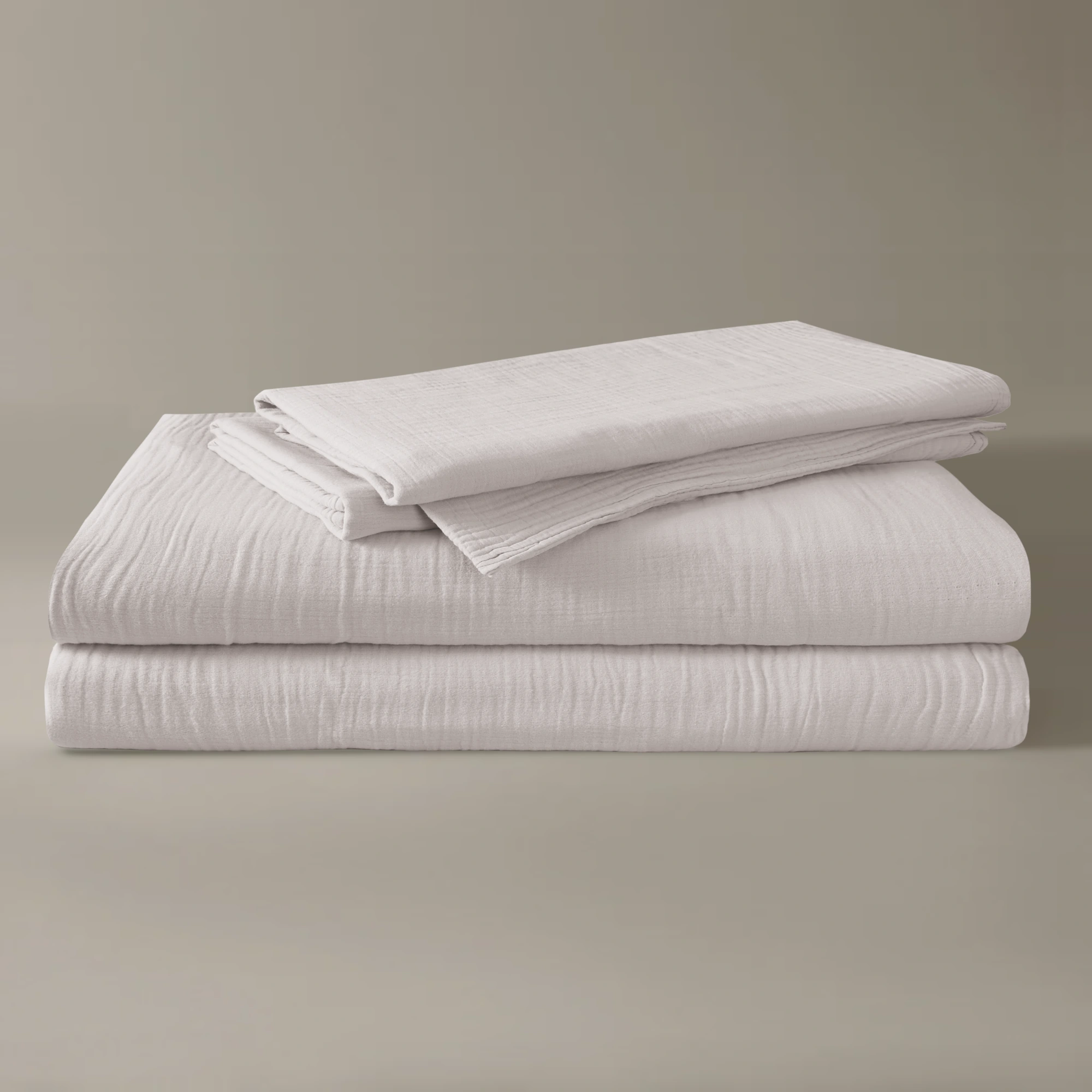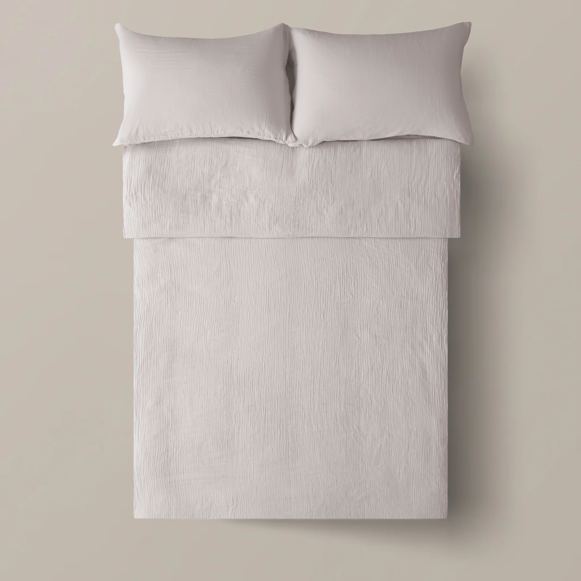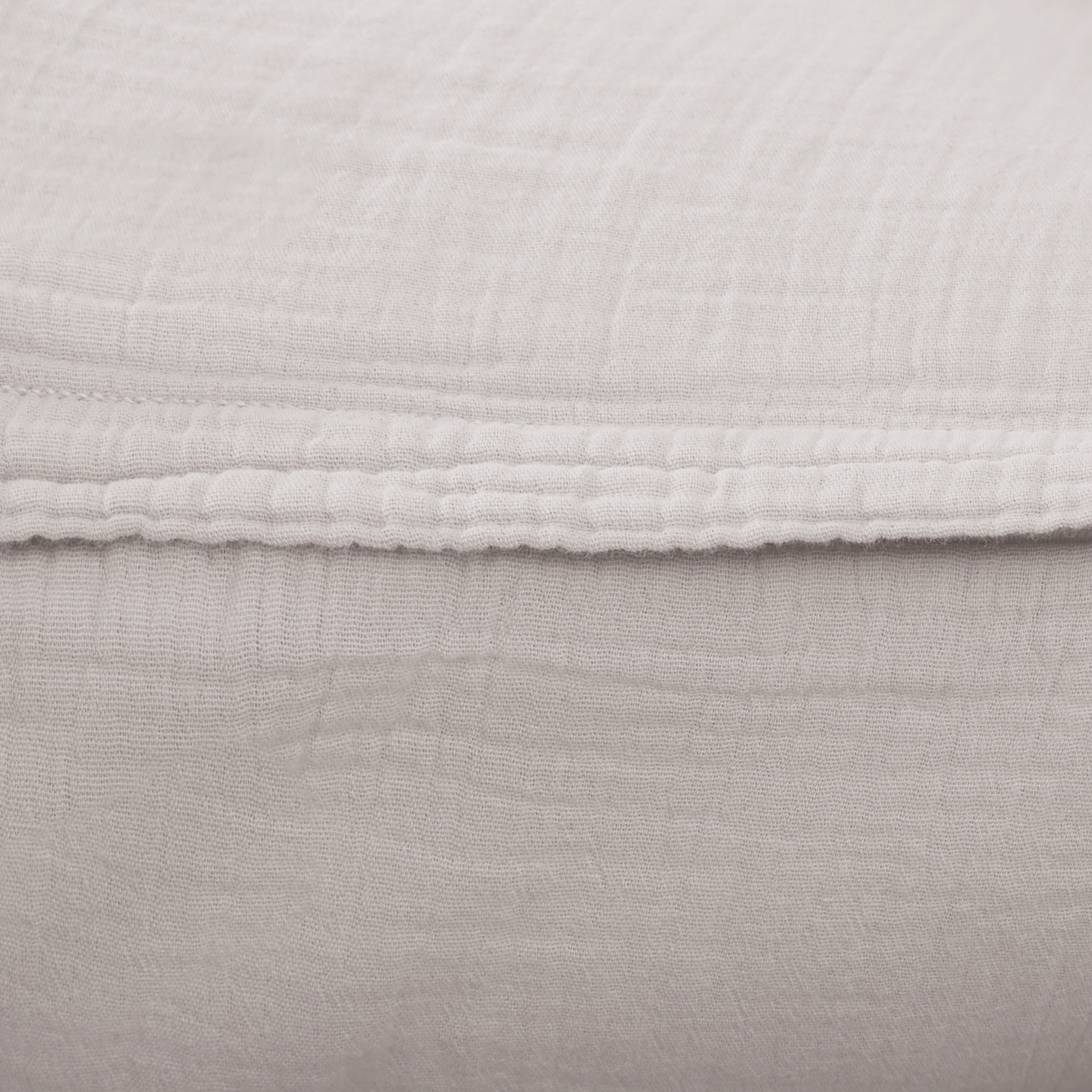 Cremeweiß wirkt weicher als klassisches Weiß und betont die natürliche Schönheit des Musselin-Gewebes. Die zweilagige Struktur aus 100% GOTS-Bio-Baumwolle wirkt besonders weich, leicht und angenehm atmungsaktiv. Ohne bügeln zu müssen bleibt die feine Crinkle-Oberfläche stets stilvoll und lebendig.
